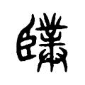 ,由「人」、「?」、「䇂」、「廾」四字構成。示刑人奉?缶以給勞役。後例由「人」、「业」(?的訛變)、「䇂」、「廾」四字構成,示受刀墨之刑的罪人,雙手奉?缶,從事勞役。戰國文字三例,前例承自金文第二例,右體中段從「言」而略有變易,下段從「廾」而有所省變。第二例右體中段「䇂」略有省變。第三例,右體下段「廾」變作「大」。在六書中屬於異文會意。