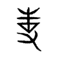 ,所持乃獵叉之省形。金文承前例,上體伸出。戰國文字之形承自金文,上體末端左折,中路叉體增一橫畫。篆文之形承自金文;古文上體與「又」分開,中路叉體變作「